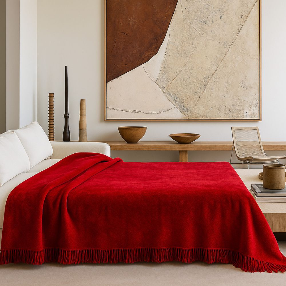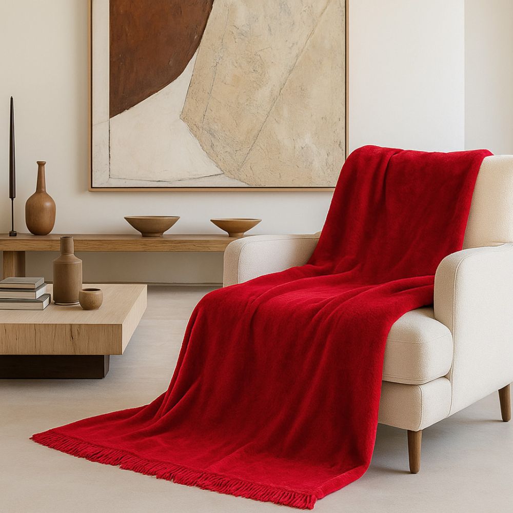 Jego nasycony czerwony odcień sprawia, że świetnie komponuje się z każdym stylem aranżacyjnym – od klasycznego po nowoczesny. Możesz wykorzystać go jako narzutę na łóżko, elegancki pled do salonu lub przytulne okrycie na chłodne wieczory.