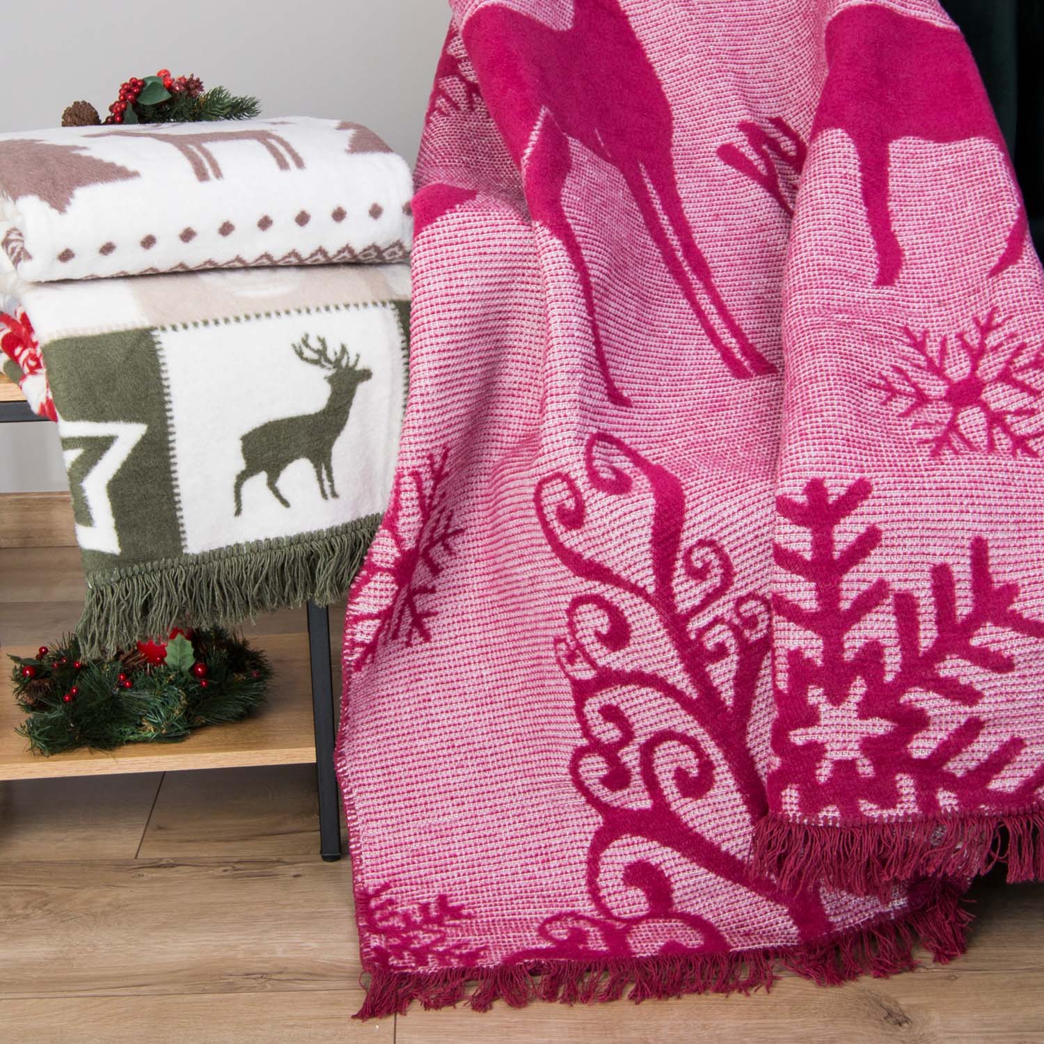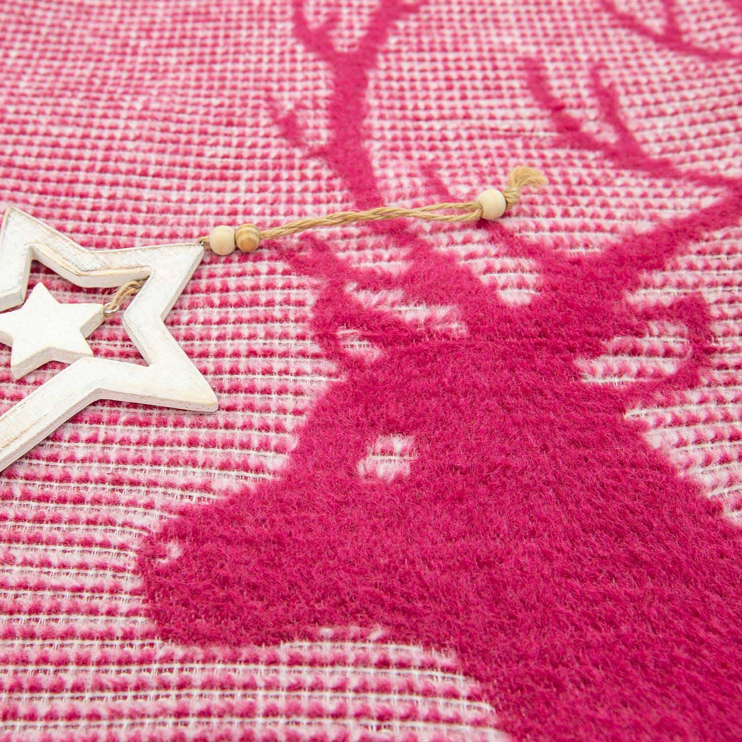 Koc bawełniany akrylowy 150x200 Świąteczny bordowy renifery 16675A