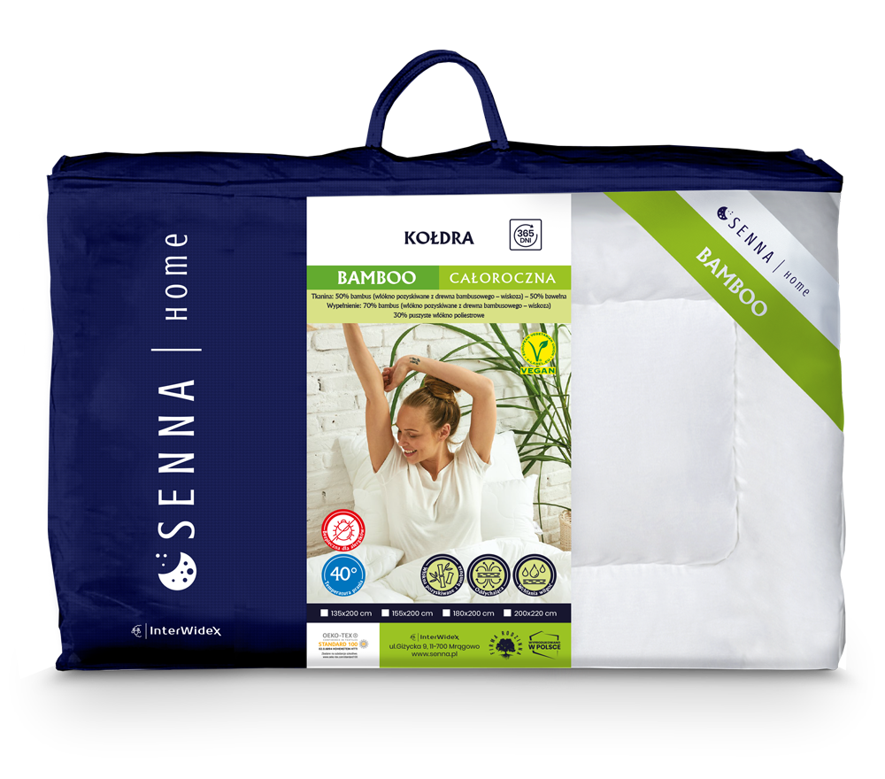 Ekologiczna kołdra antyalergiczna 155x200 Bamboo Inter-Widex o pokryciu 50% bambus(włókno pozyskiwane z drewna bambusowego - wiskoza) -50% bawełna, wypełniona 70% bambus, pozyskiwany z drewna bambusowego - 30% wiskoza puszyste włókno poliestrowe (system 3D-trwałą puszystość), co nadaje im miękkość, puszystość i trwałość. Kołdry absorbuje wilgoć 3 razy skuteczniej niż bawełna, zapewnia suchy klimat snu. Dzięki porowatej strukturze włókna ma bardzo dobrą cyrkulacje powierza. Utrudniony rozwój roztoczy sprawia także, że są one szczególnie polecane osobom cierpiącym na alergie. Kołdry te można prać nawet w 40°C, co dodatkowo zapewnia wysoki poziom higieny.