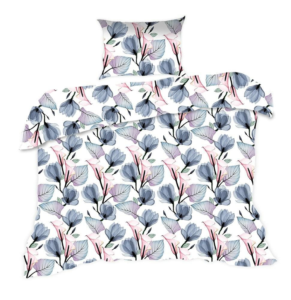 Pościel bawełniana 140x200 Classic biała niebieska różowa kwiaty liście