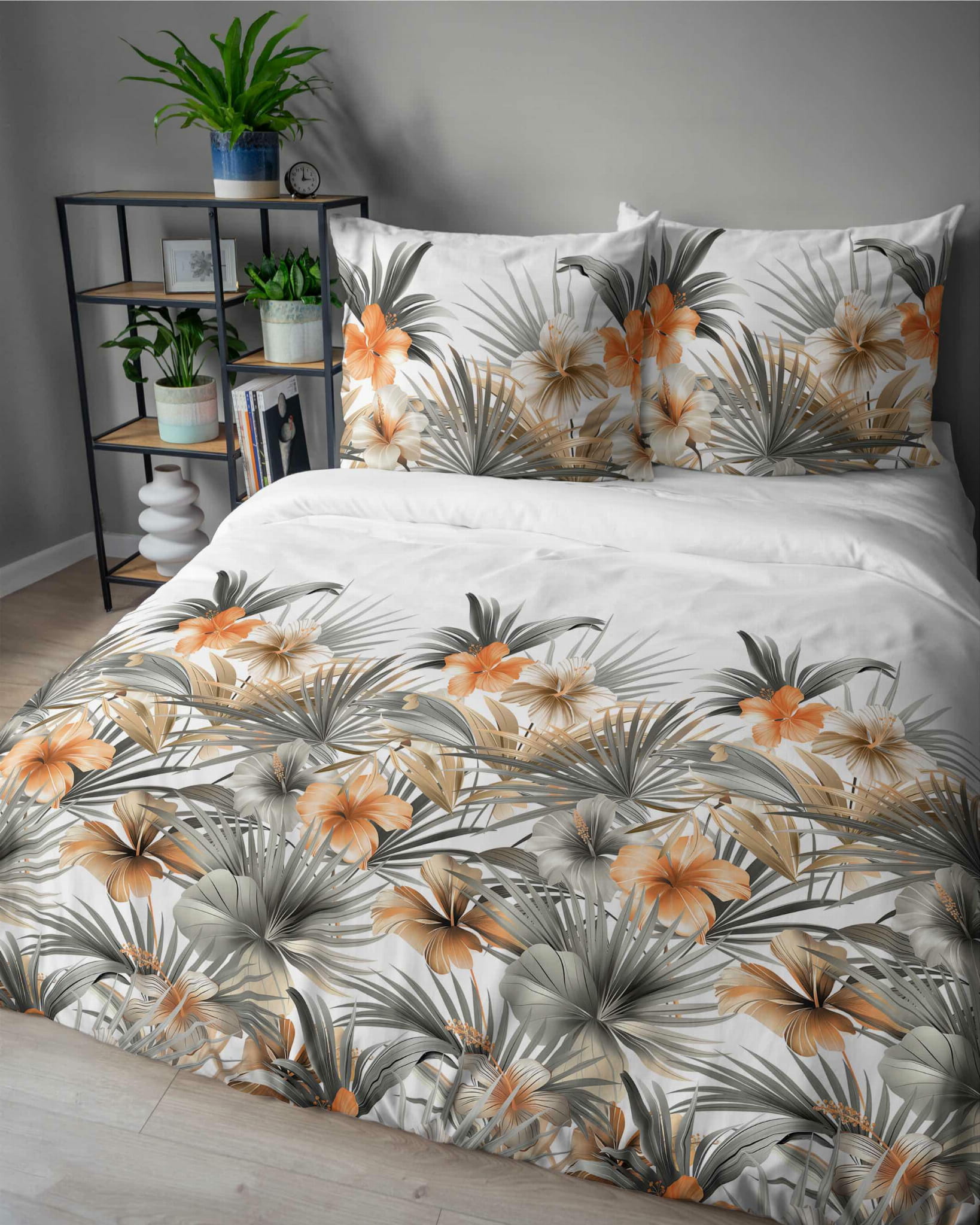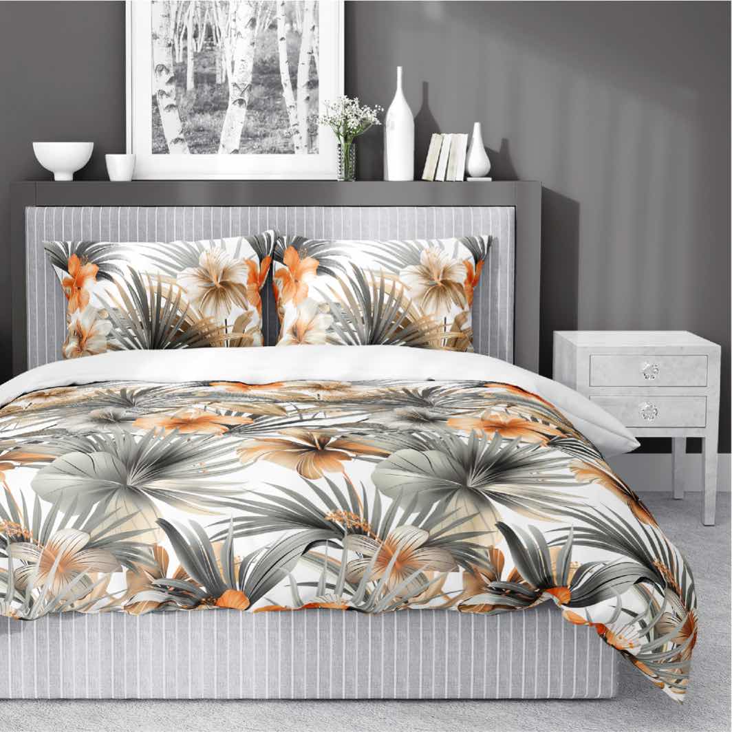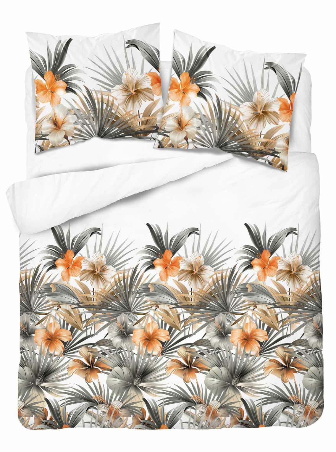 Pościel satynowa 160x200 Home Satin 71 biała w pomarańczowe kwiaty i palmy