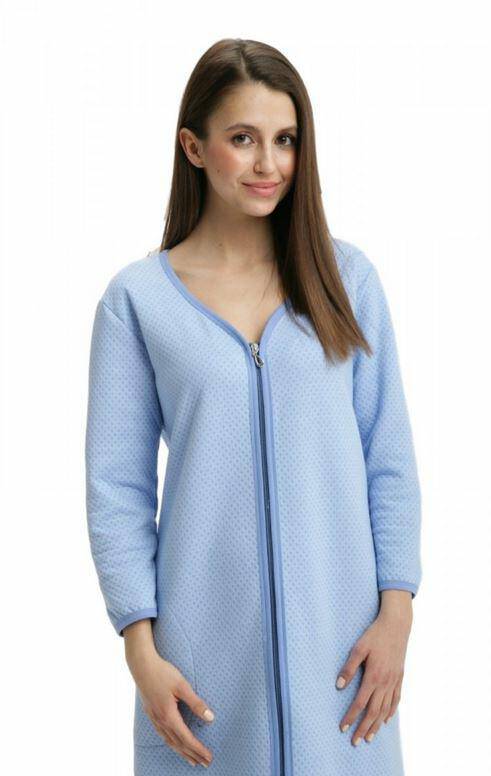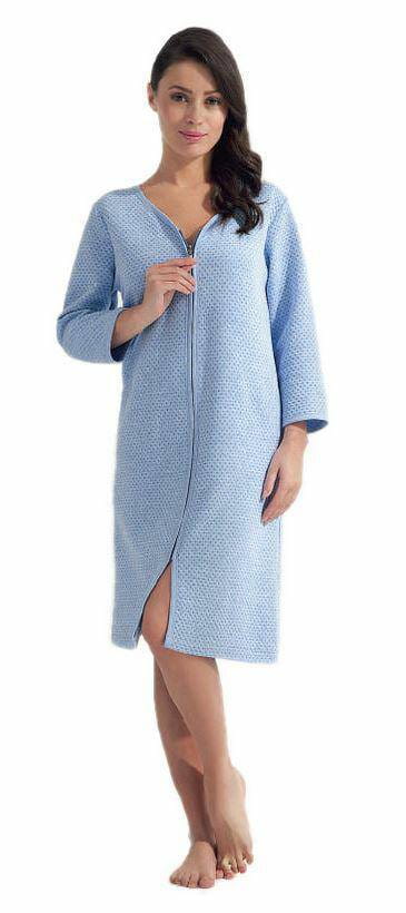 Szlafrok L Niebieski Damski Podomka został wyprodukowany z materiału o żakardowej strukturze. Podomka może zastąpić strój domowy jak i również sprawdzi się jako cieplejsze okrycie w trakcie pobytu w szpitalu lub sanatorium. Szlafrok zapinany jest na zamek błyskawiczny i posiada praktyczne kieszenie. Długość szlafroka do kolan pozwala na maksymalną swobodę ruchów.